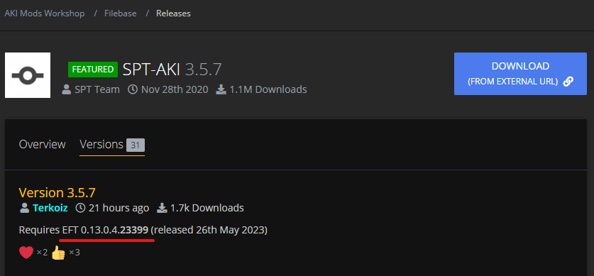 주의! 버전이 맞지 않아 "Your client is outdated. Please update EFT" 라는 메세지가 뜨며 실패한다면 아래 "더보기"를 눌러 확인하세요.